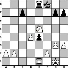game notation in PGN-format [Event "wie w"] [Site "www.myChess.de"] [Date "2013.11.16"] [Round "1"] [White "Duschgel"] [Black "Wulfen49"] [ECO "A15"] [WhitemyELO "1587"] [BlackmyELO "1356"] [Result "1-0"] [TimeControl "10/1728000"] [WhiteDays "20"] [BlackDays "20"] [MyChessNo "91131"] 1. c4 Nf6 2. g3 e6 3. Bg2 d5 4. d4 Bb4+ 5. Bd2 Bxd2+ 6. Nxd2 O-O 7. Ngf3 dxc4 8. Nxc4 Nc6 9. O-O Nd5 10. e4 Nf6 11. Re1 b5 12. Na3 b4 13. Nc4 a5 14. Rc1 Ng4 15. h3 Nf6 16. Ne3 Nxe4 17. Rxc6 Bb7 18. Rc2 a4 19. Qc1 Rc8 20. Ne5 f5 21. Nc6 Bxc6 22. Rxc6 Qd7 23. Qc4 Nd2 24. Qxb4 Ne4 25. Qxa4 Ra8 26. Qc4 Rac8 27. Bxe4 fxe4 28. Qxe6+ Qxe6 29. Rxe6 Rfe8 30. Rxe8+ Rxe8 31. Nc4 Kf8 32. Ne5 1-0 position notation in FEN-format 4rk2/2p3pp/8/4N3/3Pp3/6PP/PP3P2/4R1K1 - - - 3 32 Captured white pieces: Captured black pieces: Click on a captured piece in order to display the desired move!