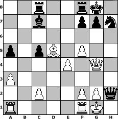 game notation in PGN-format [Event "> 1500"] [Site "www.myChess.de"] [Date "2010.03.18"] [Round "1"] [White "Winston"] [Black "gunni50"] [ECO "B20"] [WhitemyELO "1389"] [BlackmyELO "1307"] [Result "0-1"] [TimeControl "10/2592000"] [WhiteDays "90"] [BlackDays "85"] [MyChessNo "64085"] 1. e4 c5 2. Bc4 Nc6 3. Nf3 e5 4. d3 h6 5. Nc3 Nf6 6. Bd2 Bd6 7. Qe2 O-O 8. Nh4 Nd4 9. Qd1 a6 10. a3 b5 11. Ba2 a5 12. O-O b4 13. Ne2 Nxe2+ 14. Qxe2 bxa3 15. bxa3 Nh7 16. Nf5 Bc7 17. Qg4 Qf6 18. Bxh6 d5 19. Qg3 Bxf5 20. exf5 Rac8 21. Bxd5 Qxh6 22. Qg4 e4 23. dxe4 Qxh2# 0-1 position notation in FEN-format 2r2rk1/2b2ppn/8/p1pB1P2/4P1Q1/P7/2P2PPq/R4RK1 - - - 0 24 Captured white pieces: Captured black pieces: Click on a captured piece in order to display the desired move!