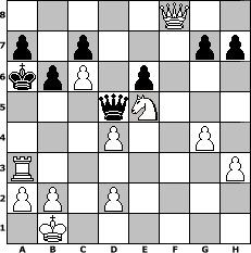game notation in PGN-format [Event "°°°°``Der sch"] [Site "www.myChess.de"] [Date "2009.05.11"] [Round "1"] [White "Zoidberg"] [Black "steff"] [ECO "D00"] [WhitemyELO "1837"] [BlackmyELO "1216"] [Result "1-0"] [TimeControl "10/864000"] [WhiteDays "30"] [BlackDays "27"] [MyChessNo "55601"] 1. d4 d5 2. e4 dxe4 3. Nc3 Nf6 4. f3 exf3 5. Nxf3 Bg4 6. h3 Bf5 7. g4 Be4 8. Nxe4 Nxe4 9. Qd3 Ng3 10. Rg1 Nxf1 11. Rxf1 Nc6 12. Be3 e6 13. O-O-O Nb4 14. Qb3 Nd5 15. Ng5 Be7 16. Nxf7 Qd7 17. Nxh8 O-O-O 18. Nf7 Rf8 19. Ne5 Qd6 20. Rxf8+ Bxf8 21. c4 Nxe3 22. Qxe3 Qa6 23. Kb1 Qb6 24. c5 Qb5 25. Qf2 b6 26. Qxf8+ Kb7 27. c6+ Ka6 28. Rd3 Qd5 29. Ra3+ 1-0 position notation in FEN-format 5Q2/p1p3pp/kpP1p3/3qN3/3P2P1/R6P/PP1P4/1K6 - - - 4 29 Captured white pieces: Captured black pieces: Click on a captured piece in order to display the desired move!