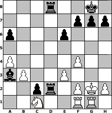 game notation in PGN-format [Event "Winterm"] [Site "www.myChess.de"] [Date "2006.11.29"] [Round "1"] [White "Naunhofer"] [Black "Meta"] [ECO "D20"] [WhitemyELO "1698"] [BlackmyELO "1836"] [Result "0-1"] [TimeControl "10/864000"] [WhiteDays "08"] [BlackDays "10"] [MyChessNo "30512"] 1. d4 d5 2. c4 dxc4 3. Nc3 c6 4. e3 b5 5. a4 b4 6. Na2 e6 7. Bxc4 Nf6 8. Nf3 c5 9. O-O Bb7 10. b3 Nbd7 11. Bb2 Bd6 12. Nc1 O-O 13. Nd3 cxd4 14. Nxd4 Nb6 15. Rc1 a6 16. Nf3 Nxc4 17. Rxc4 Bd5 18. Bxf6 Qxf6 19. Rg4 Qc3 20. Nc1 Rfd8 21. Qd4 Bxf3 22. Qxc3 bxc3 23. gxf3 c2 24. Kh1 Ba3 25. Rgg1 Rab8 26. Kg2 Rd2 27. f4 Rbd8 0-1 position notation in FEN-format 3r2k1/5ppp/p3p3/8/P4P2/bP2P3/2pr1PKP/2N2RR1 - - - 1 28 Captured white pieces: Captured black pieces: Click on a captured piece in order to display the desired move!