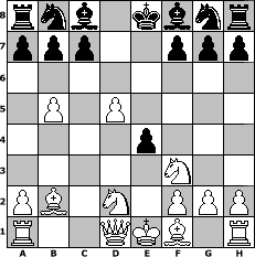 game notation in PGN-format [Event "Clubmeisterschaft 2018"] [Site "www.myChess.de"] [Date "2018.08.15"] [Round "1"] [White "martinus"] [Black "wolni55"] [ECO "A00"] [WhitemyELO "1708"] [BlackmyELO "1403"] [Result "1-0"] [TimeControl "10/2592000"] [WhiteDays "21"] [BlackDays "26"] [MyChessNo "112823"] 1. b4 e5 2. b5 d5 3. Bb2 d4 4. Nf3 Qd5 5. e3 dxe3 6. c4 exd2+ 7. Nbxd2 e4 8. cxd5 1-0 position notation in FEN-format rnb1kbnr/ppp2ppp/8/1P1P4/4p3/5N2/PB1N1PPP/R2QKB1R - KQkq - 0 8 Captured white pieces: Captured black pieces: Click on a captured piece in order to display the desired move!