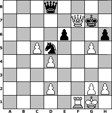 | game notation in PGN-format [Event "Winterturnier"] [Site "www.myChess.de"] [Date "2009.11.12"] [Round "1"] [White "Rotstift10"] [Black "muellerh"] [ECO "D06"] [WhitemyELO "1557"] [BlackmyELO "1480"] [Result "1-0"] [TimeControl "10/3456000"] [WhiteDays "178"] [BlackDays "098"] [MyChessNo "60551"] 1. d4 d5 2. c4 Nf6 3. Nc3 e6 4. Nf3 Bb4 5. a3 Bxc3+ 6. bxc3 O-O 7. Bg5 h6 8. Bh4 dxc4 9. e3 b5 10. Ne5 Nbd7 11. Nc6 Qe8 12. a4 g5 13. Bg3 Ne4 14. Qc2 Ndf6 15. axb5 Bd7 16. Ne5 Bxb5 17. Bxc4 Bxc4 18. Nxc4 Rc8 19. Be5 c5 20. Nd6 Nxd6 21. Bxd6 cxd4 22. exd4 Nd5 23. c4 Qd8 24. Bxf8 Qxf8 25. O-O Qe8 26. Rxa7 Qc6 27. c5 Nf4 28. f3 Nd5 29. Re1 Rb8 30. Rb1 Rf8 31. Qc4 g4 32. Ra6 Qc8 33. fxg4 Ne3 34. Qe2 Kh7 35. Rab6 Nd5 36. Qd3+ Kg7 37. Rb7 Rd8 38. Qf3 Nf6 39. Rb8 Qd7 40. Rxd8 Qxd8 41. Qf4 Qd5 42. Rf1 Qd8 43. g5 Nd5 44. Qxf7+ 1-0 position notation in FEN-format 3q4/5Qk1/4p2p/2Pn2P1/3P4/8/3P2PP/5RK1 - - - 0 44 Captured white pieces:                              Captured black pieces:                               Click on a captured piece in order to display the desired move!