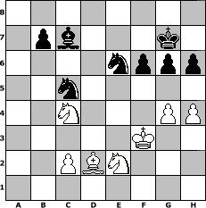 game notation in PGN-format [Event "Sommerlaune"] [Site "www.myChess.de"] [Date "2009.07.15"] [Round "1"] [White "HPB2005"] [Black "deepsabel"] [ECO "C35"] [WhitemyELO "1915"] [BlackmyELO "1977"] [Result "1/2-1/2"] [TimeControl "10/2592000"] [WhiteDays "108"] [BlackDays "144"] [MyChessNo "57515"] 1. e4 e5 2. f4 exf4 3. Nf3 Be7 4. Bc4 Nf6 5. e5 Ng4 6. O-O d6 7. exd6 Qxd6 8. d4 O-O 9. Nc3 c6 10. Qe2 Be6 11. Bd3 h6 12. Qe4 Nf6 13. Qxf4 Nbd7 14. Qxd6 Bxd6 15. b3 Rad8 16. Bd2 c5 17. b4 cxd4 18. Nb5 Bb8 19. Nbxd4 Bd5 20. Rfe1 Rfe8 21. Bc3 Rxe1+ 22. Rxe1 Bxa2 23. Nf5 Be6 24. Bd4 Kf8 25. g3 Bc7 26. Kg2 Bb6 27. Bc3 a6 28. h3 Ba7 29. Re2 Bd5 30. b5 Nc5 31. Bb4 g6 32. Ne3 axb5 33. Bxb5 Be6 34. Bc4 Re8 35. Nd4 Bxc4 36. Nxc4 Rxe2+ 37. Nxe2 Nfe4 38. g4 Kg7 39. h4 Ne6 40. Ba3 f6 41. Kf3 N4c5 42. Bb4 Bb8 43. Bd2 Bc7 1/2-1/2 position notation in FEN-format 8/1pb3k1/4nppp/2n5/2N3PP/5K2/2PBN3/8 - - - 6 44 Captured white pieces: Captured black pieces: Click on a captured piece in order to display the desired move!