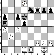 game notation in PGN-format [Event "Ostern 2011"] [Site "www.myChess.de"] [Date "2011.03.18"] [Round "2"] [White "ujack1961"] [Black "Sanji"] [ECO "C01"] [WhitemyELO "1671"] [BlackmyELO "1519"] [Result "1-0"] [TimeControl "10/2592000"] [WhiteDays "84"] [BlackDays "36"] [MyChessNo "72848"] 1. e4 e6 2. d4 d5 3. Bd3 c5 4. exd5 exd5 5. Qe2+ Be6 6. Bb5+ Nc6 7. dxc5 Bxc5 8. Nf3 a6 9. Bxc6+ bxc6 10. Be3 Qb6 11. Bxc5 Qxc5 12. Ng5 Qe7 13. Nxe6 Qxe6 14. Qxe6+ fxe6 15. O-O Kd7 16. Nd2 Rb8 17. b3 Ne7 18. Rfe1 Kd6 19. Rad1 Rb5 20. Ne4+ Kd7 21. Ng5 Rf8 22. Nxe6 Rf7 23. c4 Ra5 24. a4 Kd6 25. Nd8 1-0 position notation in FEN-format 3N4/4nrpp/p1pk4/r2p4/P1P5/1P6/5PPP/3RR1K1 - - - 2 25 Captured white pieces: Captured black pieces: Click on a captured piece in order to display the desired move!