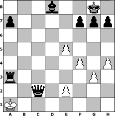 game notation in PGN-format [Event "3. Norderstedter DENK MAL Open 2012"] [Site "www.myChess.de"] [Date "2012.02.08"] [Round "1"] [White "Hobbykegler"] [Black "Tomino"] [ECO "A11"] [WhitemyELO "1005"] [BlackmyELO "1744"] [Result "0-1"] [TimeControl "10/2592000"] [WhiteDays "16"] [BlackDays "30"] [MyChessNo "79790"] 1. c4 c6 2. Qc2 Nf6 3. Nc3 d5 4. cxd5 cxd5 5. Nxd5 Nxd5 6. d4 e6 7. Bd2 Nc6 8. Nf3 Be7 9. O-O-O O-O 10. g3 Bd7 11. Ne5 Nxe5 12. dxe5 Rc8 13. Bc3 b5 14. Qb3 b4 15. Bg2 bxc3 16. Kc2 cxb2+ 17. Kxb2 Rb8 18. Bxd5 exd5 19. Rxd5 Rxb3+ 20. axb3 Qc7 21. Rhd1 Be6 22. R5d2 Rc8 23. f4 Qc3+ 24. Ka2 Bxb3+ 25. Kb1 Bxd1 26. Rxd1 Qc2+ 27. Ka1 Rc3 28. Rd8+ Bxd8 29. h4 Ra3# 0-1 position notation in FEN-format 3b2k1/p4ppp/8/4P3/5P1P/r5P1/2q1P3/K7 - - - 1 30 Captured white pieces: ![]() ![]() ![]() ![]() ![]() ![]() ![]() ![]() ![]() ![]() ![]() ![]() ![]() ![]() ![]() Captured black pieces: ![]() ![]() ![]() ![]() ![]() ![]() ![]() ![]() ![]() ![]() ![]() ![]() ![]() ![]() ![]() Click on a captured piece in order to display the desired move!