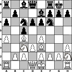 game notation in PGN-format [Event "Mit Sizialisch in den Herbst!"] [Site "www.myChess.de"] [Date "2005.09.22"] [Round "1"] [White "reisinger"] [Black "Chelly"] [ECO "B50"] [WhitemyELO "1456"] [BlackmyELO "1818"] [Result "1-0"] [TimeControl "10/1728000"] [WhiteDays "19"] [BlackDays "00"] [MyChessNo "17725"] 1. e4 c5 2. Nf3 d6 3. Bc4 Nf6 4. Nc3 Nc6 5. h3 a6 6. a4 e6 7. d3 Be7 8. Be3 O-O 9. Nh2 1-0 position notation in FEN-format r1bq1rk1/1p2bppp/p1nppn2/2p5/P1B1P3/2NPB2P/1PP1PPPN/R2QK2R - KQ - 4 9 Captured white pieces: Captured black pieces: Click on a captured piece in order to display the desired move!