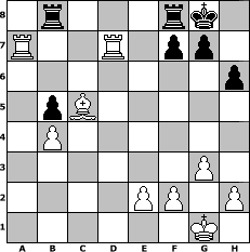 game notation in PGN-format [Event "7er2"] [Site "www.myChess.de"] [Date "2015.11.13"] [Round "1"] [White "kalle"] [Black "Joschi"] [ECO "B13"] [WhitemyELO "1599"] [BlackmyELO "1614"] [Result "1-0"] [TimeControl "10/3456000"] [WhiteDays "146"] [BlackDays "160"] [MyChessNo "101221"] 1. e4 c6 2. d4 d5 3. exd5 cxd5 4. c4 Nf6 5. Nc3 Nc6 6. cxd5 Nxd5 7. Bc4 Nf6 8. Nf3 e6 9. O-O Be7 10. a3 a6 11. b4 b5 12. Bb3 Bb7 13. Bf4 Rc8 14. Rc1 O-O 15. d5 exd5 16. Nxd5 Nxd5 17. Bxd5 Bf6 18. Qb3 Qb6 19. Be3 Nd4 20. Nxd4 Bxd5 21. Qxd5 Rcd8 22. Qc6 Bxd4 23. Qxb6 Bxb6 24. Bxb6 Rb8 25. Bc5 Rfe8 26. Rfe1 Rec8 27. Rcd1 h6 28. Re7 a5 29. Rdd7 axb4 30. axb4 Rf8 31. Ra7 Rbd8 32. g3 Rb8 33. Red7 1-0 position notation in FEN-format 1r3rk1/R2R1pp1/7p/1pB5/1P6/6P1/4PP1P/6K1 - - - 2 33 Captured white pieces: Captured black pieces: Click on a captured piece in order to display the desired move!