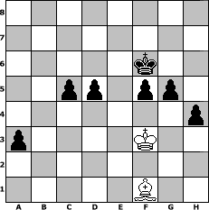 game notation in PGN-format [Event "Wanderpokal November 2006"] [Site "www.myChess.de"] [Date "2006.11.11"] [Round "1"] [White "MichaelKnopf"] [Black "Andylein1989"] [ECO "A00"] [WhitemyELO "1559"] [BlackmyELO "1442"] [Result "0-1"] [TimeControl "10/864000"] [WhiteDays "09"] [BlackDays "10"] [MyChessNo "29979"] 1. g3 d5 2. Bg2 Nf6 3. e3 Bf5 4. Ne2 e6 5. h4 Nc6 6. f3 Bd6 7. g4 Nxg4 8. fxg4 Bxg4 9. d4 Be7 10. h5 O-O 11. h6 g6 12. O-O Bg5 13. c4 Bxh6 14. cxd5 exd5 15. Nbc3 Ne7 16. Qe1 c6 17. Na4 Bxe2 18. Qxe2 Nf5 19. Qg4 Bxe3+ 20. Bxe3 Nxe3 21. Qf3 Nxf1 22. Rxf1 b6 23. Nc3 Qe7 24. Qf6 Qxf6 25. Rxf6 Rac8 26. Bh3 Rc7 27. Ne2 Re8 28. Kf2 Kg7 29. Rf3 Rce7 30. Ng1 f5 31. Bg2 h6 32. b4 Re4 33. Rd3 Rf4+ 34. Kg3 Rg4+ 35. Kf3 h5 36. a3 h4 37. Kf2 Rf4+ 38. Rf3 Rxd4 39. Ne2 Rd2 40. Bf1 Kf6 41. Re3 Rxe3 42. Kxe3 Ra2 43. Nd4 Rxa3+ 44. Kf2 c5 45. bxc5 bxc5 46. Nf3 g5 47. Kg2 a5 48. Kf2 a4 49. Kg2 Rxf3 50. Kxf3 a3 0-1 position notation in FEN-format 8/8/5k2/2pp1pp1/7p/p4K2/8/5B2 - - - 0 51 Captured white pieces: Captured black pieces: Click on a captured piece in order to display the desired move!