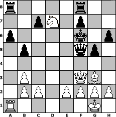 game notation in PGN-format [Event "Eine zentrale Er"] [Site "www.myChess.de"] [Date "2009.05.20"] [Round "1"] [White "kari6katz"] [Black "ujack1961"] [ECO "C70"] [WhitemyELO "1635"] [BlackmyELO "1565"] [Result "1-0"] [TimeControl "10/2592000"] [WhiteDays "90"] [BlackDays "90"] [MyChessNo "55921"] 1. e4 e5 2. Nf3 Nc6 3. Bb5 a6 4. Ba4 b5 5. Bb3 Na5 6. Nxe5 Nxb3 7. axb3 Qe7 8. d4 Nf6 9. O-O g6 10. Nd3 Bg7 11. Bg5 h6 12. Bh4 g5 13. Bg3 d6 14. e5 dxe5 15. dxe5 Nh5 16. Qxh5 O-O 17. Nc3 Bf5 18. Nd5 Qd7 19. Nf6+ Bxf6 20. exf6 Kh7 21. Qf3 Qe6 22. Rfe1 Qxf6 23. Re5 Kg6 24. Rxf5 Qxf5 25. Ne5+ Kf6 26. Nd7+ 1-0 position notation in FEN-format r4r2/2pN1p2/p4k1p/1p3qp1/8/1P3QB1/1PP1PPPP/R5K1 - - - 3 26 Captured white pieces: Captured black pieces: Click on a captured piece in order to display the desired move!