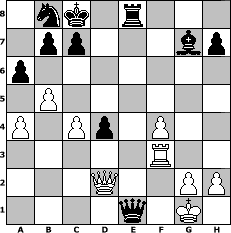 game notation in PGN-format [Event "Schwedisches Schlagen (Kubb)"] [Site "www.myChess.de"] [Date "2006.03.20"] [Round "1"] [White "Caligula"] [Black "hermtz"] [ECO "A40"] [WhitemyELO "1476"] [BlackmyELO "1680"] [Result "0-1"] [TimeControl "10/864000"] [WhiteDays "40"] [BlackDays "40"] [MyChessNo "23778"] 1. d4 e5 2. dxe5 Nc6 3. Nf3 Qe7 4. Bg5 f6 5. exf6 gxf6 6. Bf4 d6 7. Nc3 Ne5 8. e4 Bg4 9. Be2 Bxf3 10. Bxf3 O-O-O 11. Be2 Bh6 12. Bg3 Qg7 13. O-O Ne7 14. f4 N5c6 15. a3 f5 16. Rb1 fxe4 17. Nxe4 d5 18. Nc5 Rhg8 19. Ne6 Qf6 20. Nxd8 Kxd8 21. c4 d4 22. Bd3 Nf5 23. Bxf5 Qxf5 24. Rf3 Kc8 25. Qd2 Qxb1+ 26. Rf1 Qf5 27. b4 a6 28. a4 Bg7 29. b5 Nb8 30. Rf3 Re8 31. Bf2 Qb1+ 32. Be1 Qxe1+ 0-1 position notation in FEN-format 1nk1r3/1pp3bp/p7/1P6/P1Pp1P2/5R2/3Q2PP/4q1K1 - - - 0 33 Captured white pieces: Captured black pieces: Click on a captured piece in order to display the desired move!