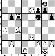 game notation in PGN-format [Event "R"] [Site "www.myChess.de"] [Date "2005.07.20"] [Round "2"] [White "Dragonwolves"] [Black "Pocket"] [ECO "D06"] [WhitemyELO "2042"] [BlackmyELO "1310"] [Result "1-0"] [TimeControl "10/2592000"] [WhiteDays "83"] [BlackDays "78"] [MyChessNo "15267"] 1. d4 d5 2. c4 Nf6 3. Nf3 e6 4. Nc3 c6 5. e3 Bb4 6. Bd3 O-O 7. O-O Nbd7 8. Bd2 c5 9. a3 Ba5 10. Qb3 Re8 11. cxd5 exd5 12. Nxd5 cxd4 13. Nxf6+ Nxf6 14. Bxa5 Qxa5 15. Nxd4 b6 16. Bb5 Bd7 17. Nc6 Qd2 18. Rad1 Be6 19. Qxe6 Qxd1 20. Qxe8+ Rxe8 21. Rxd1 h6 22. Nxa7 Re7 23. Nc8 Re5 24. a4 Re6 25. Bc4 Rc6 26. Ne7+ 1-0 position notation in FEN-format 6k1/4Npp1/1pr2n1p/8/P1B5/4P3/1P3PPP/3R2K1 - - - 4 26 Captured white pieces: Captured black pieces: Click on a captured piece in order to display the desired move!