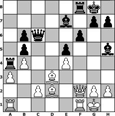 game notation in PGN-format [Event "T960-S07"] [Site "www.myChess.de"] [Date "2009.06.21"] [Round "1"] [White "Klothos@"] [Black "Erich"] [Variant "Fischerrandom"] [SetUp "1"] [FEN "rnnbbkqr/pppppppp/8/8/8/8/PPPPPPPP/RNNBBKQR w KQkq - 0 1"] [WhitemyELO "1500"] [BlackmyELO "1500"] [Result "1/2-1/2"] [TimeControl "10/3456000"] [WhiteDays "80"] [BlackDays "80"] [MyChessNo "56766"] 1. f3 d5 2. Nc3 f6 3. d4 c6 4. Nd3 Nd6 5. b3 Nd7 6. e4 e5 7. Nc5 Nxc5 8. dxc5 Nb5 9. Nxb5 cxb5 10. Be2 Be7 11. b4 dxe4 12. fxe4 Qe6 13. Qf2 O-O 14. O-O b6 15. cxb6 axb6 16. a3 Qc6 17. Bd3 Bh5 18. Bd2 Ra4 1/2-1/2 position notation in FEN-format 5rk1/4b1pp/1pq2p2/1p2p2b/rP2P3/P2B4/2PB1QPP/R4RK1 - - - 5 19 Captured white pieces: Captured black pieces: Click on a captured piece in order to display the desired move!