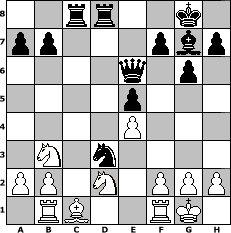 game notation in PGN-format [Event "10. Wikinger-Klubmeisterschaft"] [Site "www.myChess.de"] [Date "2014.04.29"] [Round "1"] [White "Seneca"] [Black "Grubengeist"] [ECO "D00"] [WhitemyELO "1541"] [BlackmyELO "1982"] [Result "0-1"] [TimeControl "10/2592000"] [WhiteDays "24"] [BlackDays "28"] [MyChessNo "94156"] 1. d4 d5 2. e3 Nf6 3. Bd3 g6 4. Nd2 Bg7 5. Ngf3 O-O 6. c4 c5 7. dxc5 Na6 8. cxd5 Nxc5 9. Be2 Qxd5 10. O-O Rd8 11. Qc2 Bf5 12. Qd1 Bd3 13. Bxd3 Nxd3 14. Nb3 e5 15. Qd2 Ne4 16. Rb1 Nxd2 17. Nfxd2 Rac8 18. e4 Qe6 0-1 position notation in FEN-format 2rr2k1/pp3pbp/4q1p1/4p3/4P3/1N1n4/PP1N1PPP/1RB2RK1 - - - 1 19 Captured white pieces: Captured black pieces: Click on a captured piece in order to display the desired move!