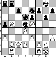 game notation in PGN-format [Event "Weihnachts-Turnier 2006"] [Site "www.myChess.de"] [Date "2006.12.24"] [Round "1"] [White "Greenhorn"] [Black "PublicEnemy"] [ECO "D21"] [WhitemyELO "1648"] [BlackmyELO "1401"] [Result "1-0"] [TimeControl "10/864000"] [WhiteDays "29"] [BlackDays "00"] [MyChessNo "31036"] 1. d4 d5 2. c4 dxc4 3. Nf3 e6 4. Qa4+ Nc6 5. e3 a6 6. Qxc4 Qd5 7. Qe2 Bb4+ 8. Nc3 Bxc3+ 9. bxc3 b5 10. Qc2 Nf6 11. c4 bxc4 12. Bxc4 Qd6 13. Bb2 O-O 14. a3 a5 15. Bb5 Bd7 16. Bd3 g6 17. h3 Rfb8 18. Rb1 Nd5 19. O-O Nce7 20. Ne5 Bb5 21. Bxb5 1-0 position notation in FEN-format rr4k1/2p1np1p/3qp1p1/pB1nN3/3P4/P3P2P/1BQP1PP1/1R3RK1 - - - 0 21 Captured white pieces: Captured black pieces: Click on a captured piece in order to display the desired move!