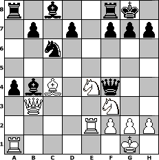 game notation in PGN-format [Event "4. Norderstedter DENK MAL Open 2013"] [Site "www.myChess.de"] [Date "2013.01.09"] [Round "1"] [White "Teresa"] [Black "haggard"] [ECO "A46"] [WhitemyELO "1509"] [BlackmyELO "1985"] [Result "0-1"] [TimeControl "10/2592000"] [WhiteDays "30"] [BlackDays "30"] [MyChessNo "86025"] 1. d4 Nf6 2. Nf3 c5 3. e4 Nxe4 4. d5 e6 5. c4 Be7 6. a3 Qa5+ 7. Nbd2 Nf6 8. Bd3 exd5 9. cxd5 Nxd5 10. O-O Nc6 11. Re1 Qc7 12. Ne4 O-O 13. b4 cxb4 14. Qb3 Nf4 15. Bxf4 Qxf4 16. axb4 Bxb4 17. Re2 a5 18. Bc4 a4 0-1 position notation in FEN-format r1b2rk1/1p1p1ppp/2n5/8/pbB1Nq2/1Q3N2/4RPPP/R5K1 - - - 0 19 Captured white pieces: Captured black pieces: Click on a captured piece in order to display the desired move!