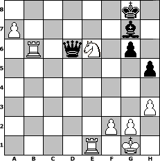 game notation in PGN-format [Event "Unter 1501"] [Site "www.myChess.de"] [Date "2020.08.24"] [Round "1"] [White "Master1"] [Black "gunni50"] [ECO "A45"] [WhitemyELO "1264"] [BlackmyELO "1241"] [Result "1-0"] [TimeControl "10/2592000"] [WhiteDays "106"] [BlackDays "088"] [MyChessNo "119114"] 1. d4 Nf6 2. e3 g6 3. Bd3 Bg7 4. Nf3 O-O 5. Nbd2 d5 6. O-O Nc6 7. Re1 Bg4 8. a3 a6 9. h3 Bxf3 10. Nxf3 b5 11. b4 e5 12. dxe5 Nd7 13. Bb2 a5 14. Bxb5 Ne7 15. Bc3 axb4 16. Bxb4 c6 17. Bxe7 Qe8 18. Bxf8 Bxf8 19. Bxc6 Qc8 20. Bxa8 Qxa8 21. e4 Nc5 22. exd5 Qd8 23. c4 Qa5 24. d6 Nd7 25. a4 Bg7 26. Qd5 Qxd5 27. a5 Qxc4 28. a6 Qe6 29. Nd4 Qd5 30. e6 fxe6 31. a7 Nb6 32. Nxe6 Qxd6 33. Rab1 h5 34. Rxb6 1-0 position notation in FEN-format 6k1/P5b1/1R1qN1p1/7p/8/7P/5PP1/4R1K1 - - - 0 34 Captured white pieces: Captured black pieces: Click on a captured piece in order to display the desired move!