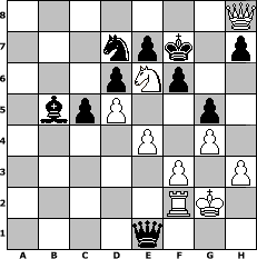 game notation in PGN-format [Event "Februar 2017"] [Site "www.myChess.de"] [Date "2017.02.05"] [Round "1"] [White "Achimkogge"] [Black "Seneca"] [ECO "B07"] [WhitemyELO "1402"] [BlackmyELO "1526"] [Result "1-0"] [TimeControl "10/1728000"] [WhiteDays "72"] [BlackDays "38"] [MyChessNo "106798"] 1. e4 d6 2. d4 Nf6 3. Bd3 g6 4. c3 Bg7 5. f3 O-O 6. Ne2 a6 7. O-O c6 8. Nf4 b5 9. b4 a5 10. d5 Qb6+ 11. Rf2 Nfd7 12. bxa5 Rxa5 13. Bc2 c5 14. a3 b4 15. Bb2 Ne5 16. Bb3 bxa3 17. Nxa3 Ba6 18. h3 Nbd7 19. c4 Rb8 20. Bc3 Rxa3 21. Rxa3 Nxc4 22. Bxc4 Bxc4 23. Bxg7 Kxg7 24. Qa1+ f6 25. Ne6+ Kf7 26. Ra8 g5 27. g4 Rxa8 28. Qxa8 Qb1+ 29. Kh2 Qe1 30. Nd8+ Kg6 31. Kg2 Bb5 32. Ne6 Kf7 33. Qh8 1-0 position notation in FEN-format 7Q/3npk1p/3pNp2/1bpP2p1/4P1P1/5P1P/5RK1/4q3 - - - 10 33 Captured white pieces: Captured black pieces: Click on a captured piece in order to display the desired move!