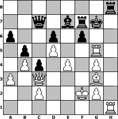 game notation in PGN-format [Event "Winterende2014"] [Site "www.myChess.de"] [Date "2014.03.06"] [Round "1"] [White "muellerh"] [Black "faustballer"] [ECO "C34"] [WhitemyELO "1532"] [BlackmyELO "1532"] [Result "1-0"] [TimeControl "10/1728000"] [WhiteDays "66"] [BlackDays "78"] [MyChessNo "93352"] 1. e4 e5 2. f4 exf4 3. Nf3 d6 4. d4 Nf6 5. Nc3 Bg4 6. Be2 a6 7. Bxf4 Nc6 8. h3 Bxf3 9. Bxf3 h6 10. O-O Be7 11. a3 g5 12. Bg3 Rb8 13. Qd2 Na7 14. Rad1 Nd7 15. Bh5 O-O 16. Rf3 Nf6 17. Bg4 Nxg4 18. hxg4 c6 19. Rdf1 Qd7 20. Qf2 Bd8 21. d5 f6 22. Qxa7 Qc7 23. Qd4 c5 24. Qd3 Qb6 25. Na4 Qc7 26. Qc3 Be7 27. b4 b6 28. Qd3 b5 29. Nb2 c4 30. Qc3 Qd7 31. Rf5 Kg7 32. Nd1 Rf7 33. Nf2 Rbf8 34. Nh3 Qc8 35. Kf2 Qc7 36. Rh1 Rh8 37. Nxg5 hxg5 38. Rxg5+ 1-0 position notation in FEN-format 7r/2q1brk1/p2p1p2/1p1P2R1/1Pp1P1P1/P1Q3B1/2P2KP1/7R - - - 0 38 Captured white pieces: Captured black pieces: Click on a captured piece in order to display the desired move!