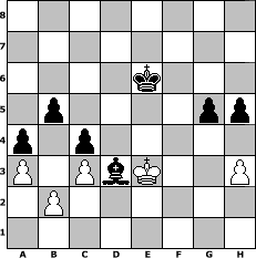 game notation in PGN-format [Event "PUNSCH-Turnier"] [Site "www.myChess.de"] [Date "2010.10.18"] [Round "1"] [White "Seneca"] [Black "Zoidberg"] [ECO "D00"] [WhitemyELO "1483"] [BlackmyELO "1841"] [Result "0-1"] [TimeControl "10/2592000"] [WhiteDays "29"] [BlackDays "30"] [MyChessNo "69068"] 1. d4 d5 2. e3 Nf6 3. Nf3 e6 4. Bd3 c5 5. c3 Nc6 6. O-O Bd6 7. Nbd2 O-O 8. h3 Bd7 9. Bc2 Rc8 10. a3 e5 11. dxe5 Nxe5 12. Nxe5 Bxe5 13. Nf3 Bb8 14. Bb3 Be6 15. Ne5 Bxe5 16. Qf3 Qe7 17. Bc2 Rfe8 18. Rb1 a5 19. Qe2 Ne4 20. Bxe4 dxe4 21. f4 exf3 22. Qxf3 Rcd8 23. e4 b5 24. Bf4 Bxf4 25. Qxf4 Bc4 26. Rfe1 a4 27. Re3 Qe5 28. Qg4 f5 29. Qg5 f4 30. Qxe5 Rxe5 31. Ree1 Bd3 32. Rbd1 c4 33. Rd2 Rde8 34. Rf2 Rxe4 35. Rxe4 Rxe4 36. Kh2 g5 37. g3 Re2 38. Kg2 Rxf2+ 39. Kxf2 fxg3+ 40. Kxg3 h5 41. Kf3 Kf7 42. Ke3 Ke6 0-1 position notation in FEN-format 8/8/4k3/1p4pp/p1p5/P1PbK2P/1P6/8 - - - 4 43 Captured white pieces: Captured black pieces: Click on a captured piece in order to display the desired move!