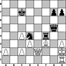 game notation in PGN-format [Event "\" Gehirn Jogging A 2 \""] [Site "www.myChess.de"] [Date "2011.12.23"] [Round "1"] [White "Rixdorfer"] [Black "BobbyF4"] [ECO "A20"] [WhitemyELO "1549"] [BlackmyELO "1463"] [Result "0-1"] [TimeControl "10/1728000"] [WhiteDays "20"] [BlackDays "15"] [MyChessNo "78475"] 1. c4 e5 2. e4 f5 3. exf5 Nf6 4. Nc3 e4 5. d3 d5 6. Bg5 Bxf5 7. Bxf6 Qxf6 8. Nxd5 Qxb2 9. Nxc7+ Kd8 10. Nd5 Bb4+ 11. Nxb4 Qc3+ 12. Ke2 Bg4+ 13. f3 exf3+ 14. Nxf3 Re8+ 15. Kf2 Bxf3 16. gxf3 Qd4+ 17. Kg2 Re6 18. Be2 Qe3 19. Kf1 Rg6 20. Qe1 Kd7 21. Nd5 Qh6 22. h3 Nc6 23. Rb1 b6 24. Rxb6 axb6 25. Nxb6+ Kc7 26. Nxa8+ Kb7 27. Nb6 Kxb6 28. Qf2+ Kb7 29. f4 Rf6 30. Bf3 Rxf4 31. Kg2 Kc7 32. Qe2 Qg5+ 33. Kh2 Nd4 0-1 position notation in FEN-format 8/2k3pp/8/6q1/2Pn1r2/3P1B1P/P1P1Q2K/7R - - - 6 34 Captured white pieces: Captured black pieces: Click on a captured piece in order to display the desired move!