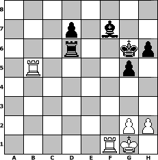 game notation in PGN-format [Event "Alt Benoni"] [Site "www.myChess.de"] [Date "2017.09.25"] [Round "1"] [White "Erich"] [Black "espero"] [ECO "A43"] [WhitemyELO "2150"] [BlackmyELO "1995"] [Result "1/2-1/2"] [TimeControl "10/2592000"] [WhiteDays "150"] [BlackDays "108"] [MyChessNo "109690"] 1. d4 c5 2. d5 Nf6 3. Nf3 c4 4. Nc3 Qa5 5. Qd4 b5 6. e4 Bb7 7. Bd2 b4 8. Nd1 e6 9. Bxc4 Bc5 10. Qd3 O-O 11. Ne3 Bxe3 12. fxe3 Rc8 13. O-O Qc5 14. b3 a5 15. Ng5 Qc7 16. Qd4 e5 17. d6 Qxc4 18. Qxc4 Rxc4 19. bxc4 h6 20. Nf3 Nxe4 21. a3 bxa3 22. Rxa3 Nc6 23. Rb1 Ba6 24. c5 Nxc5 25. Bxa5 Be2 26. Bb4 Rb8 27. Nxe5 Nxe5 28. Ra5 Ncd3 29. cxd3 Nxd3 30. Ra7 Bg4 31. Raa1 Bf5 32. Be1 Rc8 33. Rb7 Rc2 34. Rc7 Nxe1 35. Rxe1 Rd2 36. e4 Be6 37. e5 g5 38. Rb7 Kg7 39. Reb1 Rd3 40. R7b6 Kg6 41. R6b5 f6 42. exf6 Rxd6 43. Rf1 Bc4 44. f7 Bxf7 1/2-1/2 position notation in FEN-format 8/3p1b2/3r2kp/1R4p1/8/8/6PP/5RK1 - - - 0 45 Captured white pieces: Captured black pieces: Click on a captured piece in order to display the desired move!