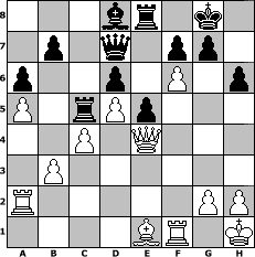 game notation in PGN-format [Event "HUBER-01-2014"] [Site "www.myChess.de"] [Date "2014.02.25"] [Round "1"] [White "Grubengeist"] [Black "ClaudiaN"] [ECO "B92"] [WhitemyELO "1971"] [BlackmyELO "1998"] [Result "1-0"] [TimeControl "10/2592000"] [WhiteDays "25"] [BlackDays "27"] [MyChessNo "93247"] 1. e4 c5 2. Nf3 d6 3. d4 cxd4 4. Nxd4 Nf6 5. Nc3 a6 6. Be2 e5 7. Nb3 Be6 8. O-O Nbd7 9. f4 Rc8 10. f5 Bc4 11. Bg5 Qc7 12. a4 h6 13. Bh4 Be7 14. a5 O-O 15. Bxc4 Qxc4 16. Kh1 Qc7 17. Ra4 Qb8 18. Qd3 Rc6 19. Nd5 Qd8 20. Bf2 Nxd5 21. exd5 Rc8 22. Nd2 Nf6 23. Ne4 Qd7 24. b3 Nxe4 25. Qxe4 Rc3 26. Be1 Rc5 27. c4 Bd8 28. Ra2 Re8 29. f6 1-0 position notation in FEN-format 3br1k1/1p1q1pp1/p2p1P1p/P1rPp3/2P1Q3/1P6/R5PP/4BR1K - - - 0 29 Captured white pieces: Captured black pieces: Click on a captured piece in order to display the desired move!