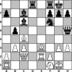 game notation in PGN-format [Event "Pott Schach - Gl"] [Site "www.myChess.de"] [Date "2016.10.25"] [Round "1"] [White "FrankB"] [Black "pepo47"] [ECO "D04"] [WhitemyELO "1668"] [BlackmyELO "2062"] [Result "0-1"] [TimeControl "10/2592000"] [WhiteDays "90"] [BlackDays "88"] [MyChessNo "105357"] 1. d4 d5 2. Nf3 Nf6 3. e3 c5 4. c3 e6 5. Bd3 Nc6 6. Nbd2 Bd6 7. O-O O-O 8. Re1 e5 9. dxc5 Bxc5 10. e4 Be6 11. exd5 Bxd5 12. Qc2 Bb6 13. h3 Rc8 14. Nxe5 Nxe5 15. Rxe5 Qd6 16. Re2 Rcd8 17. Bc4 Bc7 18. g3 Bc6 19. Nf1 Qc5 20. b3 b5 21. Be3 Qh5 0-1 position notation in FEN-format 3r1rk1/p1b2ppp/2b2n2/1p5q/2B5/1PP1B1PP/P1Q1RP2/R4NK1 - - - 2 22 Captured white pieces: Captured black pieces: Click on a captured piece in order to display the desired move!