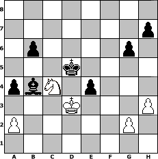 game notation in PGN-format [Event "Die letzten Sommertage!!!"] [Site "www.myChess.de"] [Date "2009.09.12"] [Round "1"] [White "beowulf"] [Black "Gauss1233"] [ECO "E61"] [WhitemyELO "1362"] [BlackmyELO "1400"] [Result "0-1"] [TimeControl "10/864000"] [WhiteDays "30"] [BlackDays "38"] [MyChessNo "58918"] 1. d4 Nf6 2. c4 g6 3. Nc3 Bg7 4. Nf3 O-O 5. Bg5 d6 6. e4 Nbd7 7. e5 dxe5 8. dxe5 Ng4 9. h3 Ngxe5 10. Nxe5 Nxe5 11. Be2 Be6 12. Qxd8 Rfxd8 13. O-O f6 14. Bf4 Bxc4 15. Bxe5 Bxe2 16. Bxc7 Bxf1 17. Bxd8 Rxd8 18. Kxf1 f5 19. Rc1 Rc8 20. Ne2 Rxc1+ 21. Nxc1 Bxb2 22. Nd3 Bd4 23. f3 Kf7 24. Ke2 e5 25. Nb4 a5 26. Nc2 Ke6 27. Kd3 Ba7 28. Na3 Bc5 29. Nc4 a4 30. Na5 b6 31. Nc4 Kd5 32. Nd2 Bb4 33. Nc4 e4+ 34. fxe4+ fxe4+ 0-1 position notation in FEN-format 8/7p/1p4p1/3k4/pbN1p3/3K3P/P5P1/8 - - - 0 35 Captured white pieces: ![]() ![]() ![]() ![]() ![]() ![]() ![]() ![]() ![]() ![]() ![]() ![]() ![]() ![]() ![]() Captured black pieces: ![]() ![]() ![]() ![]() ![]() ![]() ![]() ![]() ![]() ![]() ![]() ![]() ![]() ![]() ![]() Click on a captured piece in order to display the desired move!