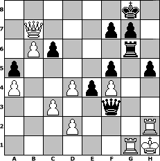 game notation in PGN-format [Event "Pott Schach - Glück Auf die xte."] [Site "www.myChess.de"] [Date "2020.11.05"] [Round "1"] [White "lotchi"] [Black "MiFie"] [ECO "D01"] [WhitemyELO "1153"] [BlackmyELO "1059"] [Result "1/2-1/2"] [TimeControl "10/2592000"] [WhiteDays "118"] [BlackDays "111"] [MyChessNo "119737"] 1. d4 d5 2. Nc3 Nf6 3. Nf3 Bf5 4. Bf4 Nc6 5. a3 e6 6. e3 Bd6 7. Ne5 O-O 8. Nxc6 bxc6 9. Bd3 h6 10. O-O c5 11. h3 c4 12. Bxf5 exf5 13. Bxd6 Qxd6 14. g3 Rab8 15. b4 c6 16. f4 Ne4 17. Nxe4 dxe4 18. c3 Qg6 19. Kg2 h5 20. h4 Rb5 21. a4 Rb7 22. Qe2 Rc7 23. Qxc4 Qg4 24. Ra2 Re8 25. b5 Re6 26. Kh2 Rg6 27. Rg2 a5 28. Rb2 Qxg3+ 29. Kh1 Qxh4+ 30. Rh2 Qg3 31. b6 Rb7 32. Qa6 Qxe3 33. Qxb7 Qd3 34. Rg1 Qf3+ 35. Rhg2 Qh3+ 36. Rh2 Qf3+ 1/2-1/2 position notation in FEN-format 6k1/1Q3pp1/1Pp3r1/p4p1p/P2PpP2/2P2q2/3P3R/6RK - - - 7 37 Captured white pieces: Captured black pieces: Click on a captured piece in order to display the desired move!