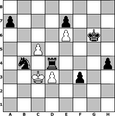 game notation in PGN-format [Event "\" Gehirn Jogging A 2 \""] [Site "www.myChess.de"] [Date "2011.12.23"] [Round "1"] [White "BobbyF4"] [Black "Duschgel"] [ECO "A00"] [WhitemyELO "1463"] [BlackmyELO "1596"] [Result "0-1"] [TimeControl "10/1728000"] [WhiteDays "14"] [BlackDays "20"] [MyChessNo "78482"] 1. g4 d5 2. Bg2 Bxg4 3. c4 c6 4. cxd5 cxd5 5. Qb3 Qc7 6. Bxd5 Qxc1+ 7. Qd1 Qxd1+ 8. Kxd1 Nc6 9. Bxc6+ bxc6 10. Nc3 g6 11. Rc1 Bg7 12. b3 Nf6 13. Na4 Rc8 14. Nc5 O-O 15. f3 Bd7 16. e4 Rfd8 17. Nxd7 Nxd7 18. Ke2 Ne5 19. Rc3 c5 20. Nh3 c4 21. f4 Nc6 22. Rxc4 Nd4+ 23. Ke3 Nc2+ 24. Ke2 Rxc4 25. bxc4 Rd4 26. d3 Nb4 27. Nf2 Nxa2 28. h4 Rd7 29. e5 f6 30. Ng4 Nb4 31. Rd1 fxe5 32. Nxe5 Bxe5 33. fxe5 Rd4 34. h5 g5 35. h6 Kf7 36. Rg1 Kg6 37. Rg3 Kxh6 38. e6 Kg6 39. Kd2 h5 40. c5 h4 41. Rf3 g4 42. Kc3 gxf3 0-1 position notation in FEN-format 8/p3p3/4P1k1/2P5/1n1r3p/2KP1p2/8/8 - - - 0 43 Captured white pieces: Captured black pieces: Click on a captured piece in order to display the desired move!