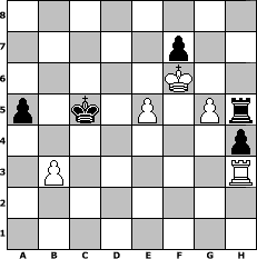 game notation in PGN-format [Event "Spa"] [Site "www.myChess.de"] [Date "2012.01.18"] [Round "1"] [White "lotchi"] [Black "borsti"] [ECO "C46"] [WhitemyELO "1297"] [BlackmyELO "1271"] [Result "1/2-1/2"] [TimeControl "10/2592000"] [WhiteDays "30"] [BlackDays "30"] [MyChessNo "79247"] 1. e4 e5 2. Nf3 Nc6 3. Nc3 Bb4 4. Bb5 Nd4 5. Be2 d6 6. a3 Bxc3 7. dxc3 Nxf3+ 8. Bxf3 Be6 9. g3 Nf6 10. Bg5 Qd7 11. Bxf6 gxf6 12. a4 a5 13. h3 Bxh3 14. Rg1 O-O-O 15. b3 Qc6 16. Rh1 Be6 17. c4 Qc5 18. Kf1 Rdg8 19. Bh5 Qd4 20. Qxd4 exd4 21. Rd1 Rg5 22. Rxd4 Kd7 23. c5 Rxc5 24. c4 Rg5 25. Kg2 f5 26. exf5 Rxf5 27. Bf3 c6 28. Rhd1 Kc7 29. Rxd6 h5 30. R6d4 Kb6 31. Be4 Re5 32. Rh1 Bg4 33. f3 Bf5 34. Bxf5 Rxf5 35. f4 Re8 36. Kf2 Kc5 37. Rd7 b6 38. Kf3 Rg8 39. Rdd1 Re8 40. Rde1 Rd8 41. Re5+ Rxe5 42. fxe5 Rh8 43. Kf4 Kb4 44. g4 h4 45. Rh3 b5 46. axb5 cxb5 47. cxb5 Kxb5 48. g5 Kc5 49. Kf5 Kd5 50. Kf6 Rh5 51. Kf5 Kc5 52. Kf6 1/2-1/2 position notation in FEN-format 8/5p2/5K2/p1k1P1Pr/7p/1P5R/8/8 - - - 8 52 Captured white pieces: Captured black pieces: Click on a captured piece in order to display the desired move!