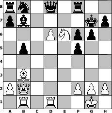 game notation in PGN-format [Event "F"] [Site "www.myChess.de"] [Date "2017.08.16"] [Round "1"] [White "miu"] [Black "Knight"] [ECO "A40"] [WhitemyELO "1515"] [BlackmyELO "1206"] [Result "1-0"] [TimeControl "10/2592000"] [WhiteDays "89"] [BlackDays "90"] [MyChessNo "109216"] 1. d4 c6 2. c4 d5 3. cxd5 Qxd5 4. Nc3 Qa5 5. Bd2 Qb6 6. e3 Qxb2 7. Rb1 Qa3 8. Qc2 Qd6 9. Ne4 Qd5 10. Bc4 Qd8 11. Nf3 Nf6 12. Nxf6+ exf6 13. O-O b5 14. Bb3 g6 15. Bc3 Bg7 16. d5 cxd5 17. Rfd1 Bb7 18. e4 O-O 19. exd5 f5 20. Bxg7 Kxg7 21. Qb2+ f6 22. Ng5 Kg8 23. d6+ Kg7 24. Ne6+ 1-0 position notation in FEN-format rn1q1r2/pb4kp/3PNpp1/1p3p2/8/1B6/PQ3PPP/1R1R2K1 - - - 2 24 Captured white pieces: Captured black pieces: Click on a captured piece in order to display the desired move!