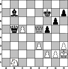 game notation in PGN-format [Event "Luisa 1 1400-1900"] [Site "www.myChess.de"] [Date "2016.09.01"] [Round "1"] [White "Adlerauge"] [Black "Wernburger"] [ECO "A00"] [WhitemyELO "1642"] [BlackmyELO "1889"] [Result "1/2-1/2"] [TimeControl "10/2592000"] [WhiteDays "30"] [BlackDays "30"] [MyChessNo "104786"] 1. Nc3 c5 2. Nf3 Nc6 3. d4 cxd4 4. Nxd4 e6 5. Bf4 a6 6. Nxc6 bxc6 7. Bd6 Bxd6 8. Qxd6 Qe7 9. Qg3 f5 10. e3 d5 11. Bd3 e5 12. O-O Nf6 13. Re1 O-O 14. Rad1 Nh5 15. Qf3 g6 16. Nxd5 cxd5 17. Qxd5+ Be6 18. Qxe5 Nf6 19. Bc4 Kf7 20. Bd3 Rfd8 21. b3 Rd5 22. Qa1 Rad8 23. Bxa6 Rxd1 24. Rxd1 Rxd1+ 25. Qxd1 Qa3 26. Bd3 Qxa2 27. Qe1 Qb2 28. h3 Ne4 29. Qa5 Qc1+ 30. Kh2 Nf6 31. Qc7+ Nd7 32. Bb5 Qd2 33. c4 Qd3 34. Ba4 Ke7 35. c5 Qd5 36. Bxd7 Qxd7 37. Qb8 Bd5 38. b4 Bb7 39. Qe5+ Kf7 40. b5 Qxb5 1/2-1/2 position notation in FEN-format 8/1b3k1p/6p1/1qP1Qp2/8/4P2P/5PPK/1N6 - - - 0 41 Captured white pieces: Captured black pieces: Click on a captured piece in order to display the desired move!