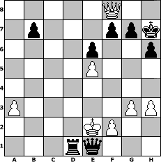 game notation in PGN-format [Event "Dabei ist alles 2"] [Site "www.myChess.de"] [Date "2008.04.04"] [Round "1"] [White "Andreas"] [Black "Andylein1989"] [ECO "B13"] [WhitemyELO "1545"] [BlackmyELO "1411"] [Result "0-1"] [TimeControl "10/864000"] [WhiteDays "10"] [BlackDays "10"] [MyChessNo "44066"] 1. e4 c6 2. d4 d5 3. exd5 cxd5 4. Nf3 Nc6 5. Nc3 Bg4 6. Be2 e6 7. O-O Bd6 8. h3 Bh5 9. Nb5 Nge7 10. Nxd6+ Qxd6 11. c3 O-O 12. Re1 Rac8 13. Ne5 Bxe2 14. Qxe2 Nxe5 15. dxe5 Qb6 16. Be3 Qc7 17. Bxa7 Nc6 18. Bc5 Rfe8 19. Bd6 Qa5 20. a3 Qb6 21. b4 Ne7 22. Bc5 Qc7 23. Rac1 Ng6 24. Bd6 Qd7 25. c4 dxc4 26. Rxc4 Rxc4 27. Qxc4 Rc8 28. Qd3 Rc6 29. Rd1 Ra6 30. g3 Qa4 31. b5 Rb6 32. Bc7 Rxb5 33. Qd8+ Nf8 34. Bd6 Qxd1+ 35. Kh2 h6 36. Qxf8+ Kh7 37. Bb4 Qf3 38. Kg1 Rd5 39. Kf1 Rd1+ 40. Be1 Qh1+ 41. Ke2 Qxe1+ 0-1 position notation in FEN-format 5Q2/1p3ppk/4p2p/4P3/8/P5PP/4KP2/3rq3 - - - 0 42 Captured white pieces: Captured black pieces: Click on a captured piece in order to display the desired move!