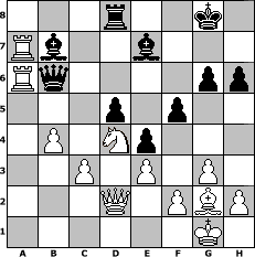 game notation in PGN-format [Event "Sommerpause"] [Site "www.myChess.de"] [Date "2011.06.29"] [Round "2"] [White "ndziemba"] [Black "Naunhofer"] [ECO "A06"] [WhitemyELO "1531"] [BlackmyELO "1611"] [Result "1-0"] [TimeControl "10/864000"] [WhiteDays "09"] [BlackDays "07"] [MyChessNo "74793"] 1. Nf3 d5 2. d4 Nf6 3. g3 e6 4. Bg2 Be7 5. O-O Nbd7 6. Nc3 O-O 7. Bf4 a6 8. Re1 b5 9. Qd3 Bb7 10. a3 c5 11. Ne5 cxd4 12. Qxd4 Bc5 13. Qd3 Qb6 14. e3 Rad8 15. Nxd7 Rxd7 16. Rad1 h6 17. Be5 Be7 18. Qe2 Rfd8 19. Rd3 b4 20. axb4 Qxb4 21. Ra1 Ne8 22. b3 f6 23. Bd4 e5 24. Na2 Qd6 25. Bc3 Qb6 26. Qd2 a5 27. Bxa5 Qe6 28. Bxd8 Rxd8 29. Nc1 Nc7 30. Ne2 e4 31. Rd4 f5 32. Rda4 Qb6 33. Nd4 g6 34. Ra7 Bb4 35. c3 Be7 36. b4 Na6 37. R1xa6 1-0 position notation in FEN-format 3r2k1/Rb2b3/Rq4pp/3p1p2/1P1Np3/2P1P1P1/3Q1PBP/6K1 - - - 0 37 Captured white pieces: Captured black pieces: Click on a captured piece in order to display the desired move!