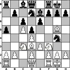 game notation in PGN-format [Event "Svetlana Open 2012"] [Site "www.myChess.de"] [Date "2012.03.22"] [Round "1"] [White "alibengali"] [Black "Naunhofer"] [ECO "D30"] [WhitemyELO "1619"] [BlackmyELO "1654"] [Result "0-1"] [TimeControl "10/2592000"] [WhiteDays "00"] [BlackDays "30"] [MyChessNo "80781"] 1. d4 d5 2. c4 e6 3. Nf3 Nf6 4. c5 c6 5. Nc3 Nbd7 6. Bg5 Be7 7. e3 a5 8. Bd3 O-O 9. O-O Ng4 0-1 position notation in FEN-format r1bq1rk1/1p1nbppp/2p1p3/p1Pp2B1/3P2n1/2NBPN2/PP1P1PPP/R2Q1RK1 - - - 4 10 Captured white pieces: ![]() ![]() ![]() ![]() ![]() ![]() ![]() ![]() ![]() ![]() ![]() ![]() ![]() ![]() ![]() Captured black pieces: ![]() ![]() ![]() ![]() ![]() ![]() ![]() ![]() ![]() ![]() ![]() ![]() ![]() ![]() ![]() Click on a captured piece in order to display the desired move!