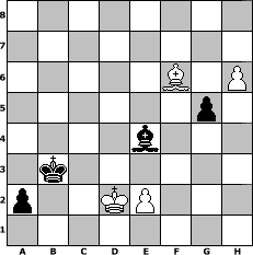 game notation in PGN-format [Event "12. HK-Turnier"] [Site "www.myChess.de"] [Date "2010.08.16"] [Round "1"] [White "Steppenwolf"] [Black "Master1"] [ECO "C60"] [WhitemyELO "1085"] [BlackmyELO "1359"] [Result "0-1"] [TimeControl "10/2592000"] [WhiteDays "27"] [BlackDays "30"] [MyChessNo "67670"] 1. e4 e5 2. Nf3 Nc6 3. Bb5 f6 4. Nc3 Nge7 5. d4 exd4 6. Nxd4 d6 7. Bf4 Bd7 8. O-O Nxd4 9. Qxd4 Bxb5 10. Rfe1 Ng6 11. Bg3 Bc6 12. Rad1 Be7 13. Nd5 O-O 14. Nxe7+ Qxe7 15. Qc4+ Kh8 16. b4 Ne5 17. Qd4 b6 18. c4 Rad8 19. f4 Ng4 20. b5 Bb7 21. h3 Nh6 22. Bh4 c5 23. Qe3 Rfe8 24. e5 dxe5 25. Rxd8 Qxd8 26. fxe5 Rxe5 27. Qf2 Rxe1+ 28. Qxe1 Nf5 29. g4 g5 30. Bf2 Nh4 31. Bxh4 Qd4+ 32. Bf2 Qe4 33. Qxe4 Bxe4 34. Be1 Bd3 35. a4 Bxc4 36. Kf2 Bb3 37. Bc3 Bxa4 38. Bxf6+ Kg8 39. Bxg5 Bxb5 40. Bf4 Kf7 41. Bb8 a5 42. Ba7 c4 43. Bxb6 a4 44. Bc5 Ke6 45. Bb4 Ke5 46. Ke3 Bc6 47. g5 Be8 48. h4 Bg6 49. Bc5 Kd5 50. Bb4 c3 51. Bxc3 Kc4 52. Bf6 Kb3 53. Kd2 a3 54. Kc1 a2 55. Kd2 Bf5 56. h5 Be4 57. g6 hxg6 58. h6 g5 0-1 position notation in FEN-format 8/8/5B1P/6p1/4b3/1k6/p2KP3/8 - - - 0 59 Captured white pieces: Captured black pieces: Click on a captured piece in order to display the desired move!