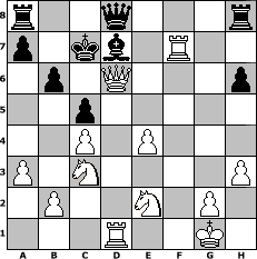 game notation in PGN-format [Event "PAL BENKO MEMORIAL TOURNAMENT"] [Site "www.myChess.de"] [Date "2019.09.05"] [Round "1"] [White "muetoe"] [Black "Winston"] [ECO "A30"] [WhitemyELO "1848"] [BlackmyELO "1448"] [Result "1-0"] [TimeControl "10/3456000"] [WhiteDays "38"] [BlackDays "38"] [MyChessNo "115757"] 1. c4 c5 2. e3 Nc6 3. d4 e6 4. d5 Ne5 5. dxe6 d6 6. Qa4+ Nc6 7. exf7+ Kxf7 8. Nc3 Bd7 9. Qc2 h6 10. h3 Be7 11. Bd3 Kf8 12. Nge2 Bg5 13. O-O Nge7 14. a3 Ne5 15. f4 Nxd3 16. fxg5+ Ke8 17. Qxd3 Bc6 18. e4 Kd7 19. Bf4 Kc7 20. Rad1 Nc8 21. Qg3 b6 22. gxh6 gxh6 23. Bxd6+ Nxd6 24. Rf7+ Bd7 25. Qxd6+ 1-0 position notation in FEN-format r2q3r/p1kb1R2/1p1Q3p/2p5/2P1P3/P1N4P/1P2N1P1/3R2K1 - - - 0 25 Captured white pieces: Captured black pieces: Click on a captured piece in order to display the desired move!