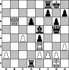 game notation in PGN-format [Event "Es wurde noch etwas sommerlich."] [Site "www.myChess.de"] [Date "2009.08.09"] [Round "1"] [White "Winston"] [Black "nyffhans"] [ECO "B20"] [WhitemyELO "1387"] [BlackmyELO "1586"] [Result "0-1"] [TimeControl "10/2592000"] [WhiteDays "30"] [BlackDays "30"] [MyChessNo "58193"] 1. e4 c5 2. c4 Nc6 3. Nf3 g6 4. d4 cxd4 5. Nxd4 Bg7 6. Nf3 d6 7. h3 Nf6 8. Nc3 Nd7 9. Be3 Qa5 10. Bd2 Nc5 11. Nd5 Qd8 12. Rb1 Nxe4 13. Be3 e6 14. Nf4 O-O 15. Bd3 Nc5 16. Bc2 Nb4 17. O-O e5 18. Nd5 Nxc2 19. Qxc2 Bf5 20. Qd2 Bxb1 21. Rxb1 Ne4 22. Qb4 b6 23. Bg5 Nxg5 24. Nxg5 Qxg5 25. Re1 Rac8 26. b3 Rc5 27. Qc3 b5 28. Qa5 bxc4 29. Qxa7 Rxd5 30. bxc4 Rd4 31. Qa6 e4 32. Re3 Be5 33. Qb6 Rd1+ 0-1 position notation in FEN-format 5rk1/5p1p/1Q1p2p1/4b1q1/2P1p3/4R2P/P3PPP1/3r2K1 - - - 4 34 Captured white pieces: Captured black pieces: Click on a captured piece in order to display the desired move!