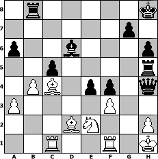game notation in PGN-format [Event "K"] [Site "www.myChess.de"] [Date "2004.04.28"] [Round "1"] [White "Juri"] [Black "Gambitianer"] [ECO "B20"] [WhitemyELO "1453"] [BlackmyELO "1554"] [Result "0-1"] [TimeControl "10/3456000"] [WhiteDays "120"] [BlackDays "109"] [MyChessNo "4208"] 1. e4 c5 2. Bc4 e6 3. Nc3 Nc6 4. Nf3 a6 5. d4 cxd4 6. Nxd4 Qc7 7. Nxc6 dxc6 8. Qf3 Bd6 9. g3 b5 10. Bd3 Bb7 11. O-O h6 12. Ne2 Nf6 13. Bf4 e5 14. Be3 O-O 15. a3 c5 16. c4 bxc4 17. Bxc4 Bxe4 18. Qxe4 Nxe4 19. Bd5 Nxg3 20. Nxg3 Rab8 21. b3 Kh8 22. Rac1 f5 23. Bd2 Qe7 24. Bc4 e4 25. b4 f4 26. Ne2 Qh4 27. f3 Rf5 28. Kh1 Rh5 0-1 position notation in FEN-format 1r5k/6p1/p2b3p/2p4r/1PB1pp1q/P4P2/3BN2P/2R2R1K - - - 3 29 Captured white pieces: ![]() ![]() ![]() ![]() ![]() ![]() ![]() ![]() ![]() ![]() ![]() ![]() ![]() ![]() ![]() Captured black pieces: ![]() ![]() ![]() ![]() ![]() ![]() ![]() ![]() ![]() ![]() ![]() ![]() ![]() ![]() ![]() Click on a captured piece in order to display the desired move!