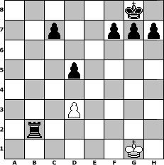 game notation in PGN-format [Event "Fr"] [Site "www.myChess.de"] [Date "2013.03.20"] [Round "1"] [White "Wulfen49"] [Black "Lohl"] [ECO "C45"] [WhitemyELO "1289"] [BlackmyELO "1679"] [Result "0-1"] [TimeControl "10/2592000"] [WhiteDays "29"] [BlackDays "22"] [MyChessNo "87285"] 1. e4 e5 2. Nf3 Nc6 3. d4 exd4 4. Nxd4 Nf6 5. Nc3 Bb4 6. Bc4 Nxe4 7. Qe2 O-O 8. Qd3 d5 9. Nxc6 bxc6 10. Bb3 a5 11. O-O Ba6 12. Qd1 Nxc3 13. bxc3 Bxc3 14. Rb1 Bxf1 15. Qxf1 a4 16. Bb2 Qf6 17. Bxc3 Qxc3 18. Qd3 Qxd3 19. cxd3 axb3 20. axb3 Ra2 21. Kf1 Re8 22. b4 Ree2 23. b5 Rxf2+ 24. Kg1 Rxg2+ 25. Kh1 Rxh2+ 26. Kg1 cxb5 27. Rxb5 Rhb2 28. Rxb2 Rxb2 0-1 position notation in FEN-format 6k1/2p2ppp/8/3p4/8/3P4/1r6/6K1 - - - 0 29 Captured white pieces: ![]() ![]() ![]() ![]() ![]() ![]() ![]() ![]() ![]() ![]() ![]() ![]() ![]() ![]() ![]() Captured black pieces: ![]() ![]() ![]() ![]() ![]() ![]() ![]() ![]() ![]() ![]() ![]() ![]() ![]() ![]() ![]() Click on a captured piece in order to display the desired move!