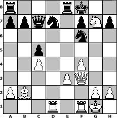 game notation in PGN-format [Event "RDK Open 2007"] [Site "www.myChess.de"] [Date "2007.05.29"] [Round "1"] [White "Meta"] [Black "Devine"] [ECO "A01"] [WhitemyELO "2197"] [BlackmyELO "2021"] [Result "1-0"] [TimeControl "10/3456000"] [WhiteDays "40"] [BlackDays "30"] [MyChessNo "35252"] 1. b3 e5 2. Bb2 Nc6 3. e3 Nf6 4. Ne2 d5 5. d4 Bd6 6. dxe5 Nxe5 7. Ng3 Be6 8. Nc3 c6 9. Qd2 Qe7 10. Nce2 O-O 11. f3 Rfd8 12. Nd4 Qc7 13. Ndf5 Bf8 14. Be2 c5 15. O-O g6 16. f4 Ned7 17. Nh4 Bg4 18. c4 dxc4 19. Bxg4 Nxg4 20. Qe2 Ngf6 21. bxc4 Bh6 22. Rad1 Re8 23. Qf3 Bg7 24. Nhf5 gxf5 25. Nxf5 Kf8 26. Nxg7 1-0 position notation in FEN-format r3rk2/ppqn1pNp/5n2/2p5/2P2P2/4PQ2/PB4PP/3R1RK1 - - - 0 26 Captured white pieces: Captured black pieces: Click on a captured piece in order to display the desired move!
