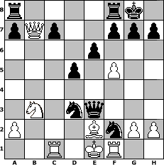 game notation in PGN-format [Event "2016"] [Site "www.myChess.de"] [Date "2016.01.01"] [Round "1"] [White "S04boy"] [Black "muetoe"] [ECO "D02"] [WhitemyELO "1235"] [BlackmyELO "1916"] [Result "0-1"] [TimeControl "10/2592000"] [WhiteDays "27"] [BlackDays "24"] [MyChessNo "101954"] 1. d4 d5 2. Nf3 Bf5 3. Bf4 e6 4. Nc3 Bd6 5. Bxd6 Qxd6 6. Nb5 Qb4+ 7. c3 Qxb5 8. e4 Qxb2 9. exf5 Qxc3+ 10. Nd2 Nf6 11. Rc1 Qxd4 12. Qb3 O-O 13. Qxb7 Ng4 14. Kd1 Nxf2+ 15. Ke1 Nd7 16. Nb3 Qe3+ 17. Be2 Ne5 18. Rf1 Ned3# 0-1 position notation in FEN-format r4rk1/pQp2ppp/4p3/3p1P2/8/1N1nq3/P3BnPP/2R1KR2 - - - 8 19 Captured white pieces: Captured black pieces: Click on a captured piece in order to display the desired move!