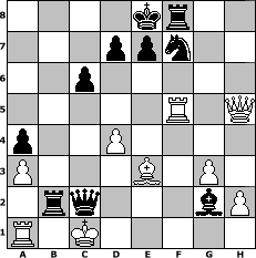game notation in PGN-format [Event "April April April"] [Site "www.myChess.de"] [Date "2016.04.15"] [Round "1"] [White "Joschi"] [Black "muetoe"] [Variant "Fischerrandom"] [SetUp "1"] [FEN "rqnnkrbb/pppppppp/8/8/8/8/PPPPPPPP/RQNNKRBB w KQkq - 0 1"] [WhitemyELO "1522"] [BlackmyELO "1983"] [Result "0-1"] [TimeControl "10/2592000"] [WhiteDays "118"] [BlackDays "119"] [MyChessNo "103291"] 1. Nd3 g6 2. Nc3 f5 3. f4 c6 4. g3 Bc4 5. Nf2 b5 6. d3 b4 7. Ncd1 Bd5 8. e4 fxe4 9. Bxe4 a5 10. c3 bxc3 11. Nxc3 Qb4 12. a3 Bxc3+ 13. bxc3 Qxc3+ 14. Ke2 Be6 15. Rc1 Qg7 16. Qc2 g5 17. fxg5 Qxg5 18. Bg2 a4 19. d4 Nd6 20. Ne4 Bc4+ 21. Ke1 Nxe4 22. Qxe4 Qa5+ 23. Kd1 Bb3+ 24. Ke2 Bd5 25. Qxh7 Bxg2 26. Rc5 Qa6+ 27. Kd2 Rb8 28. Qh5+ Nf7 29. Rf5 Qc4 30. Be3 Rb2+ 31. Kd1 Qd3+ 32. Kc1 Qc2# 0-1 position notation in FEN-format 4kr2/3ppn2/2p5/5R1Q/p2P4/P3B1P1/1rq3bP/R1K5 - k - 14 33 Captured white pieces: ![]() ![]() ![]() ![]() ![]() ![]() ![]() ![]() ![]() ![]() ![]() ![]() ![]() ![]() ![]() Captured black pieces: ![]() ![]() ![]() ![]() ![]() ![]() ![]() ![]() ![]() ![]() ![]() ![]() ![]() ![]() ![]() Click on a captured piece in order to display the desired move!