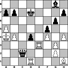 game notation in PGN-format [Event "Myschach 960er Blitz-Open"] [Site "www.myChess.de"] [Date "2006.02.28"] [Round "2"] [White "MichaelKnopf"] [Black "Juri"] [Variant "Fischerrandom"] [SetUp "1"] [FEN "qnnrkrbb/pppppppp/8/8/8/8/PPPPPPPP/QNNRKRBB w KQkq - 0 1"] [WhitemyELO "1531"] [BlackmyELO "1428"] [Result "0-1"] [TimeControl "10/86400"] [WhiteDays "04"] [BlackDays "02"] [MyChessNo "23104"] 1. g3 d5 2. b3 f5 3. d4 g6 4. Nc3 e5 5. Nb5 Na6 6. dxe5 Nd6 7. Nxd6+ cxd6 8. f4 Nb4 9. Qb2 Qc8 10. c3 Nc6 11. exd6 Nb4 12. Bd4 Bxd4 13. Rxd4 Nc6 14. Rd3 Rxd6 15. e3 Qe6 16. Kd2 Kd7 17. Ne2 Re8 18. a4 Na5 19. Nd4 Qe7 20. b4 Nc4+ 21. Kc2 Nxb2 22. Kxb2 Qd8 23. Nb5 Qb6 24. Nxd6 Rxe3 25. a5 Re2+ 26. Kb3 Qxd6 27. h4 d4+ 28. c4 Re3 29. Rfd1 Qc7 30. Rxe3 Qxc4+ 31. Ka4 Qc2+ 0-1 position notation in FEN-format 6b1/pp1k3p/6p1/P4p2/KP1p1P1P/4R1P1/2q3P1/3R3B - - - 2 32 Captured white pieces: Captured black pieces: Click on a captured piece in order to display the desired move!