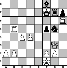 game notation in PGN-format [Event "Skandinavium II"] [Site "www.myChess.de"] [Date "2006.01.06"] [Round "1"] [White "Seneca"] [Black "Hobbykegler"] [ECO "B01"] [WhitemyELO "1672"] [BlackmyELO "1243"] [Result "1-0"] [TimeControl "10/864000"] [WhiteDays "10"] [BlackDays "09"] [MyChessNo "21442"] 1. e4 d5 2. exd5 Qxd5 3. Nc3 Qe6+ 4. Be2 Nf6 5. Nf3 Ng4 6. O-O Nc6 7. Re1 Qh6 8. h3 Nf6 9. d4 Be6 10. Bxh6 gxh6 11. Bb5 a6 12. Bxc6+ bxc6 13. Ne5 Rd8 14. Nxc6 Bd5 15. Nxd8 Kxd8 16. Nxd5 Nxd5 17. c4 Nb4 18. Qa4 Nd3 19. Re2 Rg8 20. Qxa6 Nf4 21. Re4 Nxh3+ 22. Kf1 Ng5 23. Re5 f6 24. Rd5+ Ke8 25. Qc8+ Kf7 26. Re1 e6 27. Qxc7+ Kg6 28. Rb5 Rg7 29. Qg3 f5 30. Rxe6+ Kf7 31. Rxh6 1-0 position notation in FEN-format 5b2/5krp/7R/1R3pn1/2PP4/6Q1/PP3PP1/5K2 - - - 0 31 Captured white pieces: Captured black pieces: Click on a captured piece in order to display the desired move!