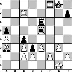 game notation in PGN-format [Event "Die letzen Wintertage!"] [Site "www.myChess.de"] [Date "2016.02.21"] [Round "1"] [White "Seneca"] [Black "S04boy"] [ECO "A21"] [WhitemyELO "1523"] [BlackmyELO "1196"] [Result "1-0"] [TimeControl "10/2592000"] [WhiteDays "119"] [BlackDays "111"] [MyChessNo "102628"] 1. c4 e5 2. Nc3 Bb4 3. a3 Bxc3 4. bxc3 Na6 5. e3 Nf6 6. Nf3 d6 7. Be2 Bf5 8. O-O e4 9. Nd4 d5 10. Nxf5 Nc5 11. Nxg7+ Kf8 12. Nf5 Qd7 13. Nd4 Nd3 14. Bxd3 exd3 15. cxd5 Qxd5 16. Qb3 Rg8 17. Qxd5 Nxd5 18. a4 c5 19. Ba3 b6 20. g3 a5 21. Nf3 Rb8 22. Ne5 Nf6 23. Rab1 Re8 24. Rxb6 Rxe5 25. Rxf6 Rg4 26. Rf4 Rg6 27. Rb1 Rge6 28. Rb7 Kg7 29. Rbxf7+ Kg8 30. Rc7 c4 31. Rf8# 1-0 position notation in FEN-format 5Rk1/2R4p/4r3/p3r3/P1p5/B1PpP1P1/2PP1P1P/6K1 - - - 1 31 Captured white pieces: Captured black pieces: Click on a captured piece in order to display the desired move!