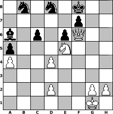 game notation in PGN-format [Event "5erd2"] [Site "www.myChess.de"] [Date "2017.01.17"] [Round "1"] [White "martinus"] [Black "spiderman"] [ECO "D02"] [WhitemyELO "1774"] [BlackmyELO "1821"] [Result "1-0"] [TimeControl "10/2592000"] [WhiteDays "95"] [BlackDays "79"] [MyChessNo "106509"] 1. d4 d5 2. Nf3 Nf6 3. c4 dxc4 4. Nc3 c6 5. e4 b5 6. Be2 b4 7. Na4 Nxe4 8. Bxc4 Nd6 9. Bb3 e6 10. O-O Be7 11. Bf4 O-O 12. Qc2 g5 13. Bc1 Ba6 14. Rd1 Bb5 15. Nc5 a5 16. a4 bxa3 17. bxa3 Re8 18. a4 Ba6 19. Ne5 Ra7 20. Rb1 Bf6 21. f4 gxf4 22. Bxf4 Bg5 23. Qf2 Qf6 24. Bxg5 Qxg5 25. Bc2 Rc8 26. Rb3 Kh8 27. Rg3 Qd8 28. Bxh7 Rcc7 29. Rg8+ Qxg8 30. Bxg8 Kxg8 31. Qg3+ Kf8 32. Rb1 Rab7 33. Nxb7 Rxb7 34. Rxb7 Nxb7 35. Qf3 Nd8 36. Qf6 1-0 position notation in FEN-format 1n1n1k2/5p2/b1p1pQ2/p3N3/P2P4/8/3P2PP/6K1 - - - 3 36 Captured white pieces: Captured black pieces: Click on a captured piece in order to display the desired move!