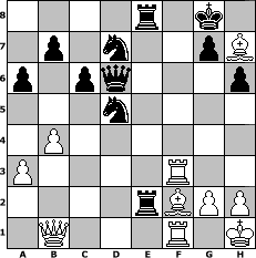 game notation in PGN-format [Event "Rund ums K"] [Site "www.myChess.de"] [Date "2004.09.28"] [Round "2"] [White "PeterLoskarn"] [Black "Phantasos"] [ECO "C30"] [WhitemyELO "1902"] [BlackmyELO "1906"] [Result "1/2-1/2"] [TimeControl "10/2592000"] [WhiteDays "088"] [BlackDays "115"] [MyChessNo "7170"] 1. e4 e5 2. f4 Bc5 3. Nf3 d6 4. c3 Bb6 5. d4 exd4 6. cxd4 Bg4 7. Be3 Qe7 8. Nc3 Nf6 9. e5 Nc6 10. Qd2 Nd7 11. Nd5 Qd8 12. Be2 Be6 13. Nc3 Ne7 14. O-O dxe5 15. fxe5 O-O 16. Bd3 f6 17. Na4 Nd5 18. Nxb6 N7xb6 19. exf6 Nxf6 20. Bg5 c6 21. Qc2 h6 22. Bd2 Bd5 23. Rae1 Bxf3 24. Rxf3 Qxd4+ 25. Be3 Qa4 26. b3 Qb4 27. Ref1 Nbd7 28. Bf5 Rfe8 29. Qc1 Re7 30. Kh1 Rae8 31. a3 Qd6 32. b4 Nd5 33. Bf2 a6 34. Qb1 Re2 35. Bh7+ 1/2-1/2 position notation in FEN-format 4r1k1/1p1n2pB/p1pq3p/3n4/1P6/P4R2/4rBPP/1Q3R1K - - - 3 35 Captured white pieces: ![]() ![]() ![]() ![]() ![]() ![]() ![]() ![]() ![]() ![]() ![]() ![]() ![]() ![]() ![]() Captured black pieces: ![]() ![]() ![]() ![]() ![]() ![]() ![]() ![]() ![]() ![]() ![]() ![]() ![]() ![]() ![]() Click on a captured piece in order to display the desired move!