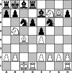 game notation in PGN-format [Event "Windecker Herbst-Open"] [Site "www.myChess.de"] [Date "2014.10.08"] [Round "1"] [White "espero"] [Black "UPS"] [ECO "B20"] [WhitemyELO "1764"] [BlackmyELO "1650"] [Result "1-0"] [TimeControl "10/1728000"] [WhiteDays "20"] [BlackDays "00"] [MyChessNo "96202"] 1. e4 c5 2. d4 cxd4 3. c3 dxc3 4. Nxc3 Nc6 5. Nf3 e5 6. Bc4 Be7 7. Qd5 d6 8. Qxf7+ Kd7 9. Qxg7 Nf6 10. Bh6 Kc7 11. Ng5 Qf8 12. Nb5+ Kb8 13. O-O-O Qxg7 14. Bxg7 Rd8 15. Nf7 1-0 position notation in FEN-format rkbr4/pp2bNBp/2np1n2/1N2p3/2B1P3/8/PP2PPPP/2KR3R - - - 2 15 Captured white pieces: Captured black pieces: Click on a captured piece in order to display the desired move!